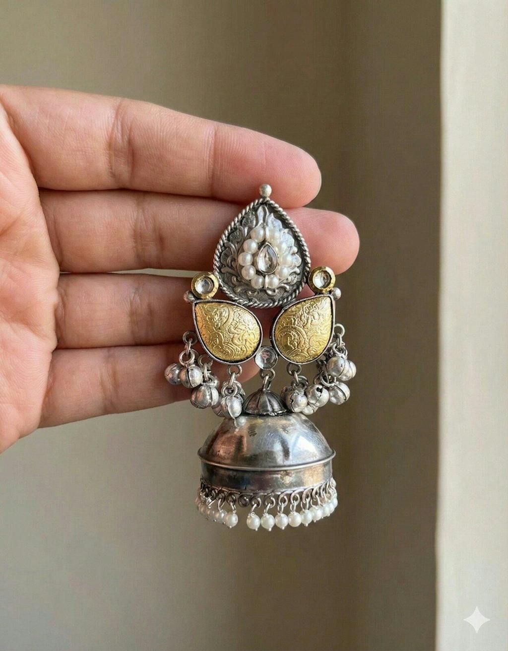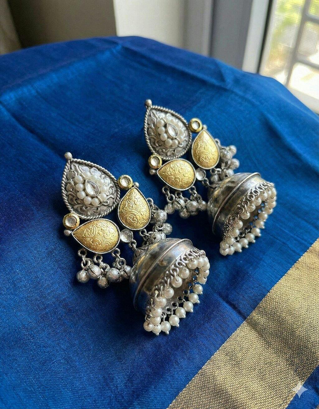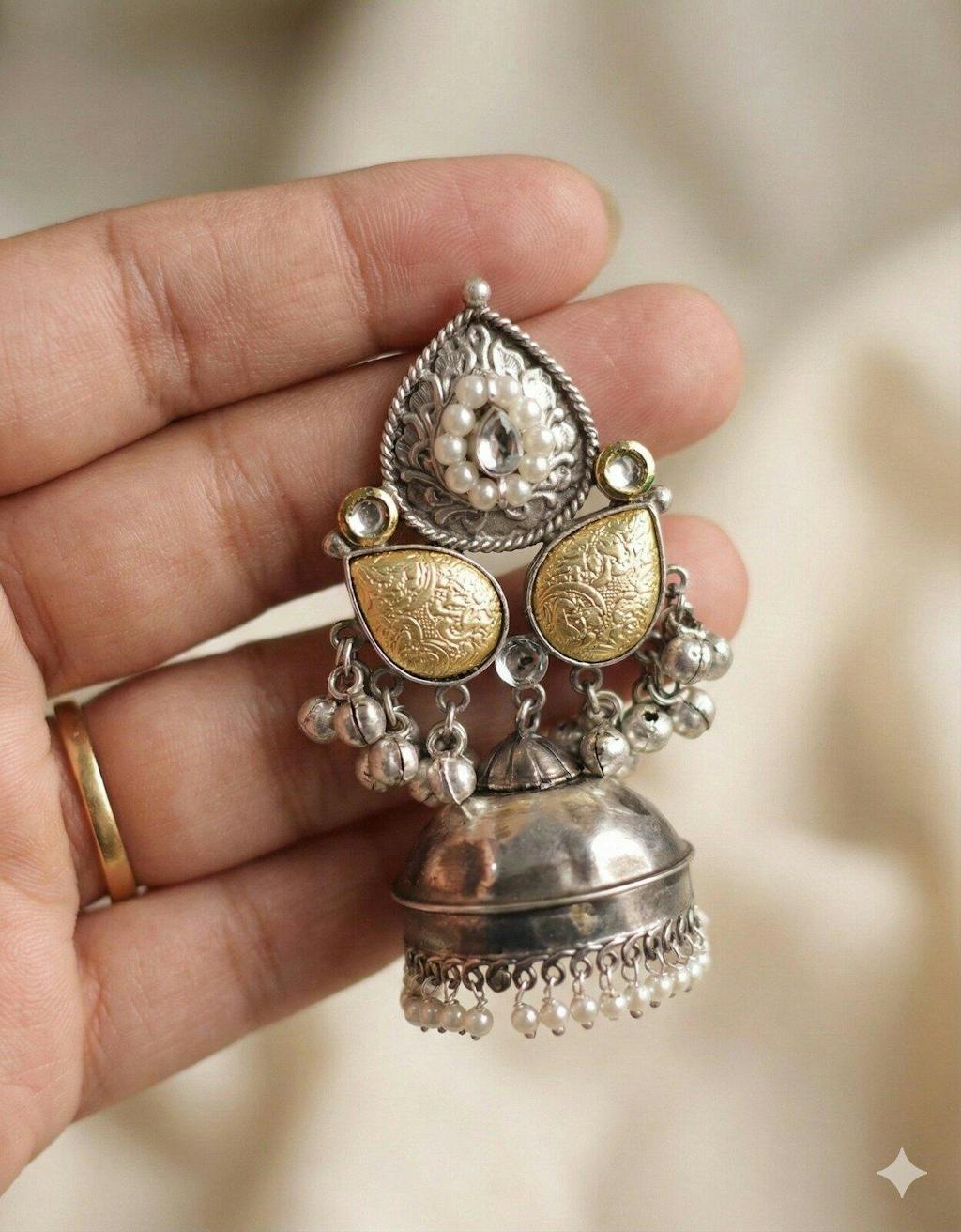 Introducing our bestseller - Dual Shade Jhumkas. Beautifully handcrafted with stunning blend of oxidised and gold tones. Light in weight and absolutely nickel-free, ensuring no skin allergies. Celebrated for their exquisite design and exceptional popularity. A must have accessory for any jewellery collection.