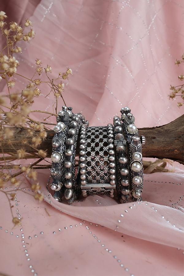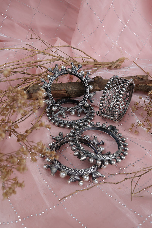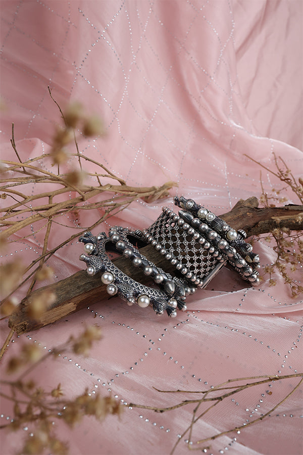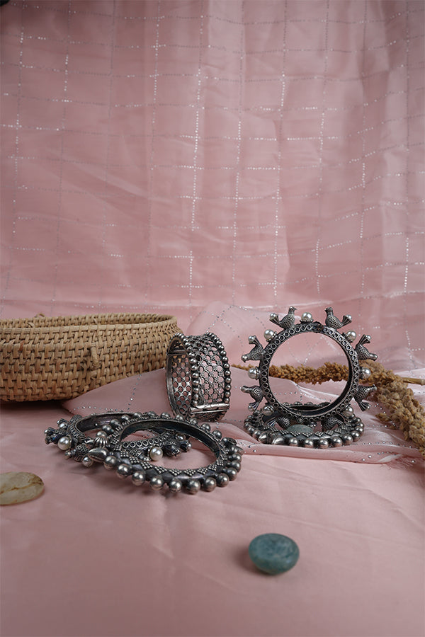 Elevate any outfit with our stack of oxidized and brass kadas, inspired by Shilpa Shetty. These statement pieces are delightfully lightweight and perfect for adding a touch of glamour. Make a bold fashion statement with this versatile accessory.