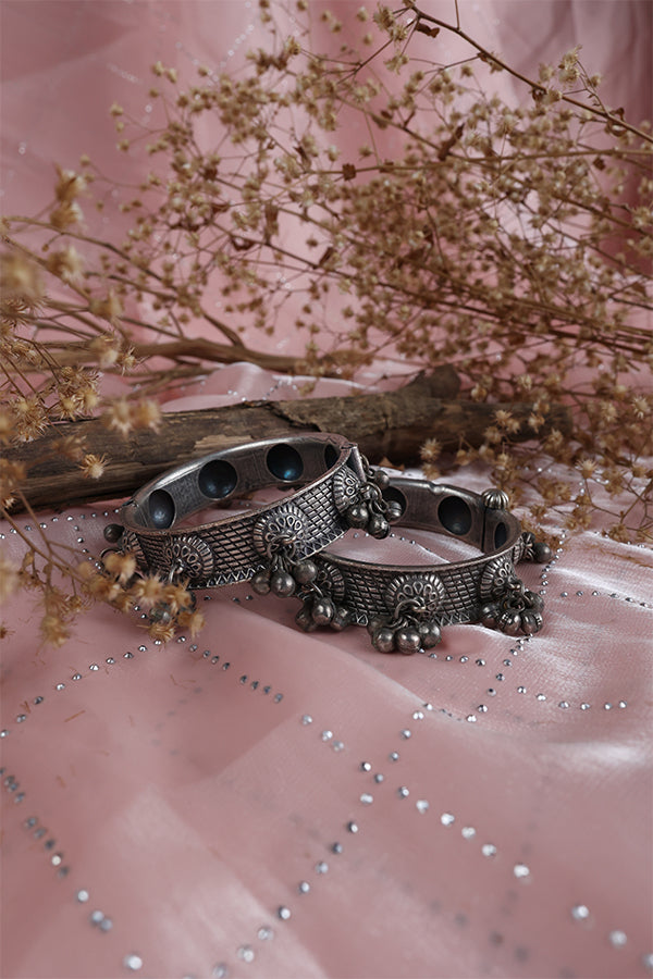 Symbolizing elegance, these oxidized brass kadas are adorned with ghungroos for an extra touch of grace. "Shringa," meaning peak or horn, reflects their sophisticated design. Lightweight and nickel-free, these kadas are perfect for effortless elegance.