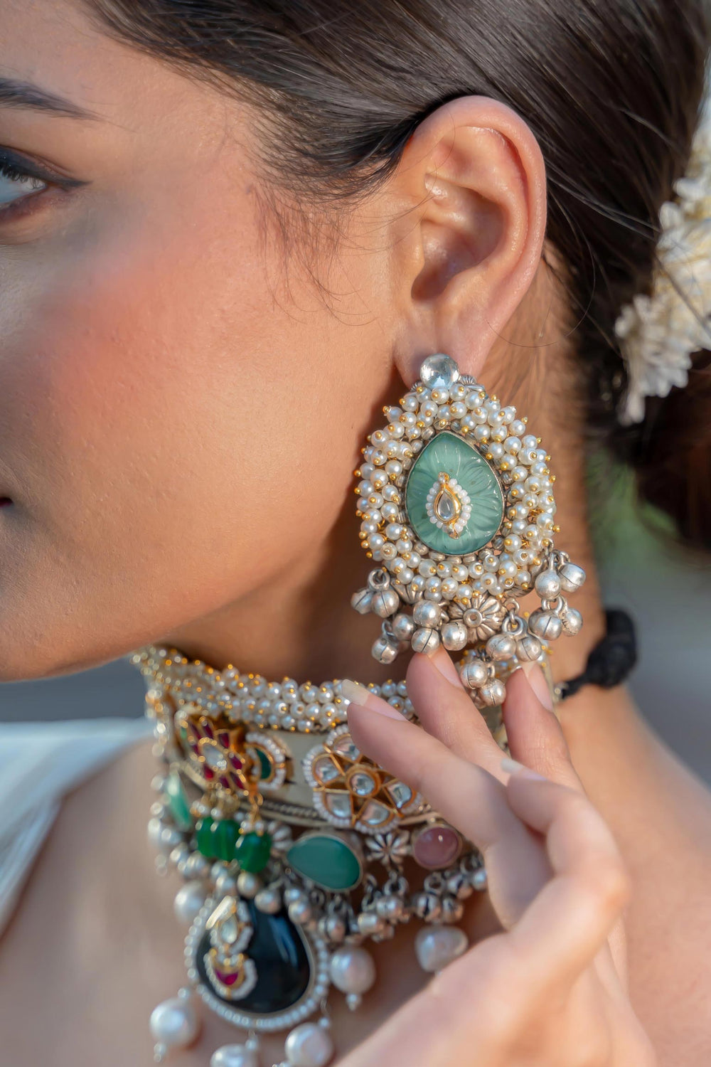 Introducing the Trinetra Choker with earrings, a stunning piece featuring intricate hand carvings and crafted from pure brass with an oxidized finish. Adorned with exquisite Kundan and Moti work, this choker radiates elegance and divine energy. As one of our bestsellers, it promises to elevate your style with its unparalleled craftsmanship and timeless beauty.